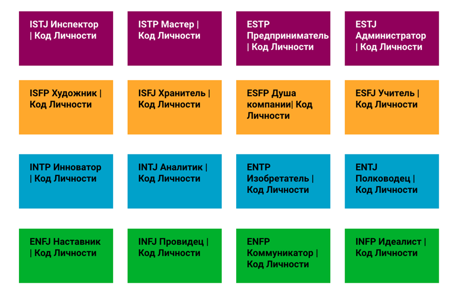 В типологии MBTI каждый тип человека обозначен буквами (всего их 4). Вот значение каждой буквы: