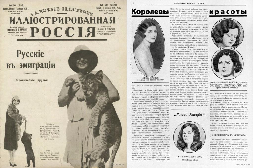 Первый конкурс красоты среди эмигранток прошел под эгидой журнала «Иллюстрированная Россия». Это издание было подобием современного глянца. Сама же идея проведения конкурса красоты возникла по причине того, что в среде эмигранток было необычайно много женщин, трудившихся моделями на подиумах, позировавших для фотоателье и художников.