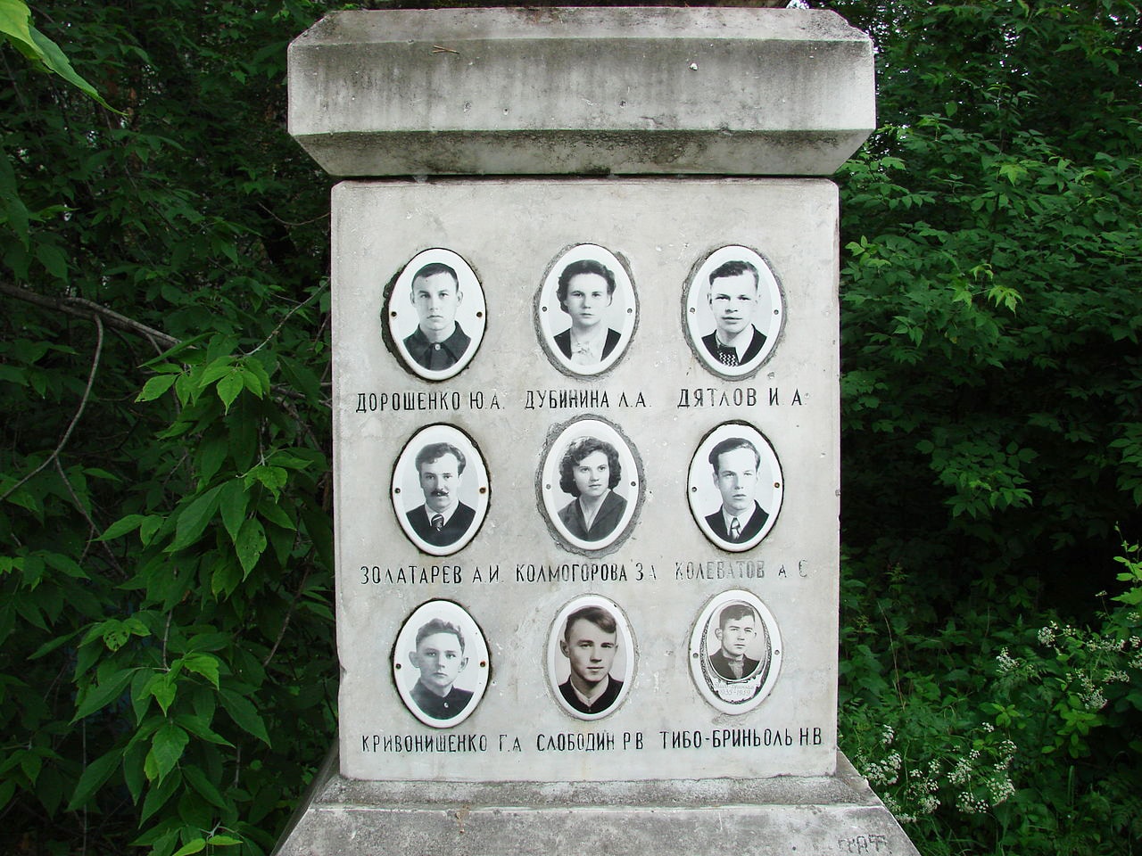 Фото членов тургруппы на памятнике (инициалы и фамилия Золотарёва выбиты с ошибками)